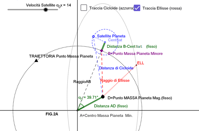La FIG.2A da "L'OROLOGIO DI TYCHO BRAHE" (vedi i suoi CAP avanti) sintetizza in un grafico i moti dei Pianeti, dove il Pianeta Mag. può rappresentare il Sole, il Min. la Terra e il Satellite la Luna ( è indicata la traccia delle distanze ellittiche in rosso Sole-Terra, non è indicata quella cicloide della Luna-Sole, indicata nell'applet: